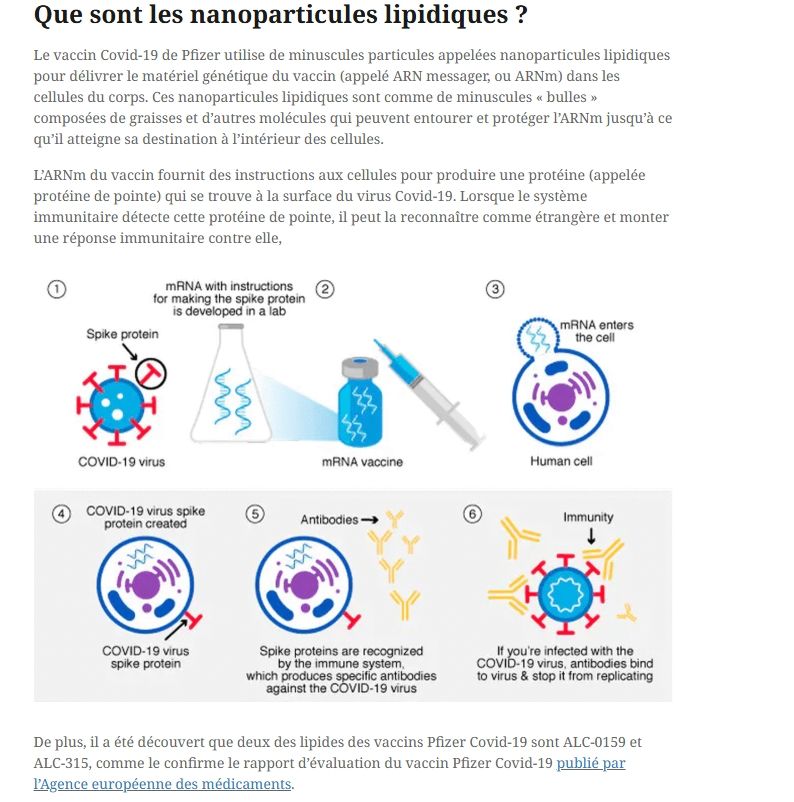 Il y a-t-il de l’oxyde de graphène dans les injections ? Plusieurs études montrent que des nanoparticules d’oxyde de graphène peuvent franchir la barrière hémato-encéphalique (BHE), surtout lorsqu’elles sont de petite taille (<100 nm) ou fonctionnalisées. Cela signifie qu’après une injection (vaccination ou autre), une fraction de l’oxyde de graphène peut : circuler dans le sang,franchir la BHE, et s’accumuler dans certaines régions du cerveau (cortex, hippocampe, cervelet selon les modèles animaux). Transport et dispersion dans l’organisme . Une fois dans le corps, l’oxyde de graphène se comporte comme une nanoparticule : Dans le sang Le GO se lie aux protéines plasmatiques (phénomène dit protéine " corona ").... ça nous rappelle un truc ... Il circule avec le flux sanguin et peut être transporté dans tout l’organisme. Dans les cellules Le GO peut entrer dans les cellules par endocytose (la cellule « avale » la nanoparticule). Il peut s’accumuler dans le cytoplasme et même interagir avec les mitochondries ou le noyau. Barrières biologiques franchissables Barrière hémato-encéphalique (BHE) : certaines études montrent que le GO peut franchir cette barrière protectrice du cerveau, en particulier sous forme de nanoplaquettes fonctionnalisées. Placenta : des travaux préliminaires suggèrent aussi un passage possible vers le fœtus. Bioaccumulation : Le GO tend à s’accumuler dans le foie, la rate, les reins et les poumons, principaux organes de filtration. Il peut persister longtemps, car l’élimination par voie rénale n’est pas toujours efficace. Facteurs influençant la dispersion Taille des nanoparticules : plus elles sont petites, plus elles circulent facilement. Charge de surface : l’oxyde de graphène est chargé négativement → interaction avec membranes cellulaires. Fonctionnalisation : quand on ajoute des molécules (PEG (présent dans les vaccins contre la COVID-19, protéines, etc.), cela modifie sa solubilité et sa diffusion. Vous trouverez l’une des 100 vidéos mettant un évidence le " hurlement " d’un appareil placé sur le corps d’une personne vaccinée contre la COVID-19. Les détails de l’appareil et surtout la procédure de détection d’implants ou d’oxyde de graphène doit être scrupuleusement appliquée afin d’éviter des faux positifs.